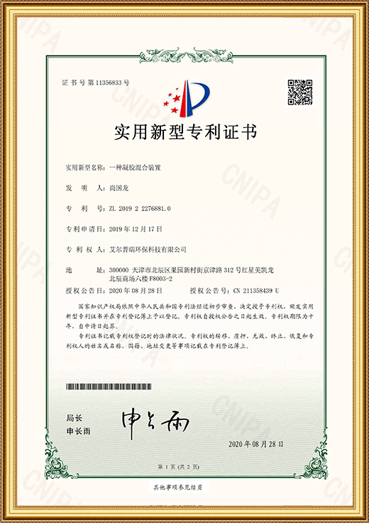 • 實用新型專利證書(一種凝膠混合裝置)